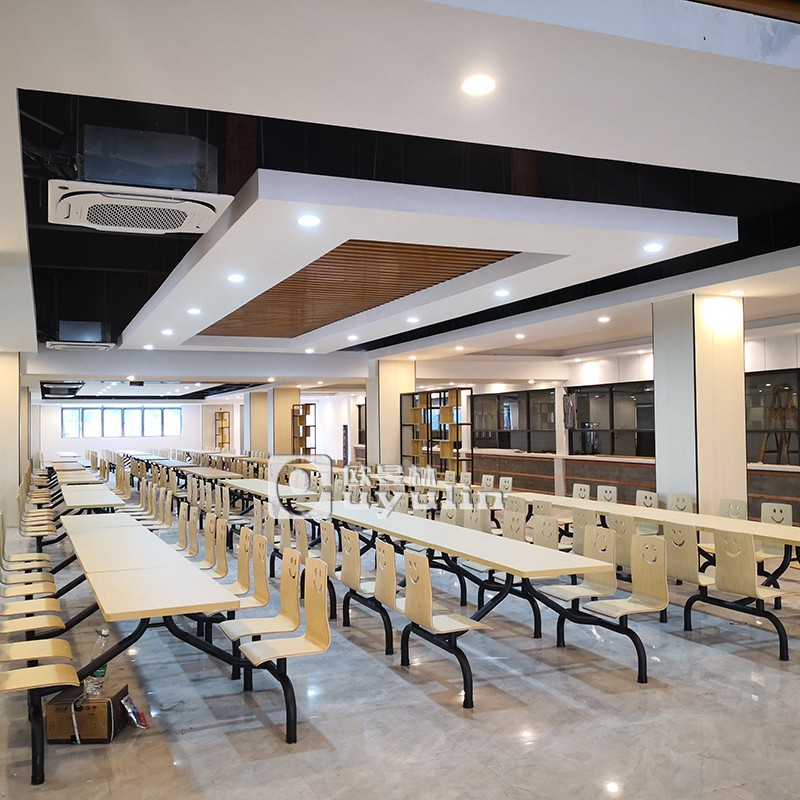 該項目是江門學校食堂餐桌椅定制采購項目,所以選擇桌椅的時候強調座位數要多,而且桌椅以固定為主,強調美觀得來又耐用。因此選的是連體餐桌椅,材質的為防火板和不銹鋼桌腳組成,打造溫馨舒適的食堂餐廳。